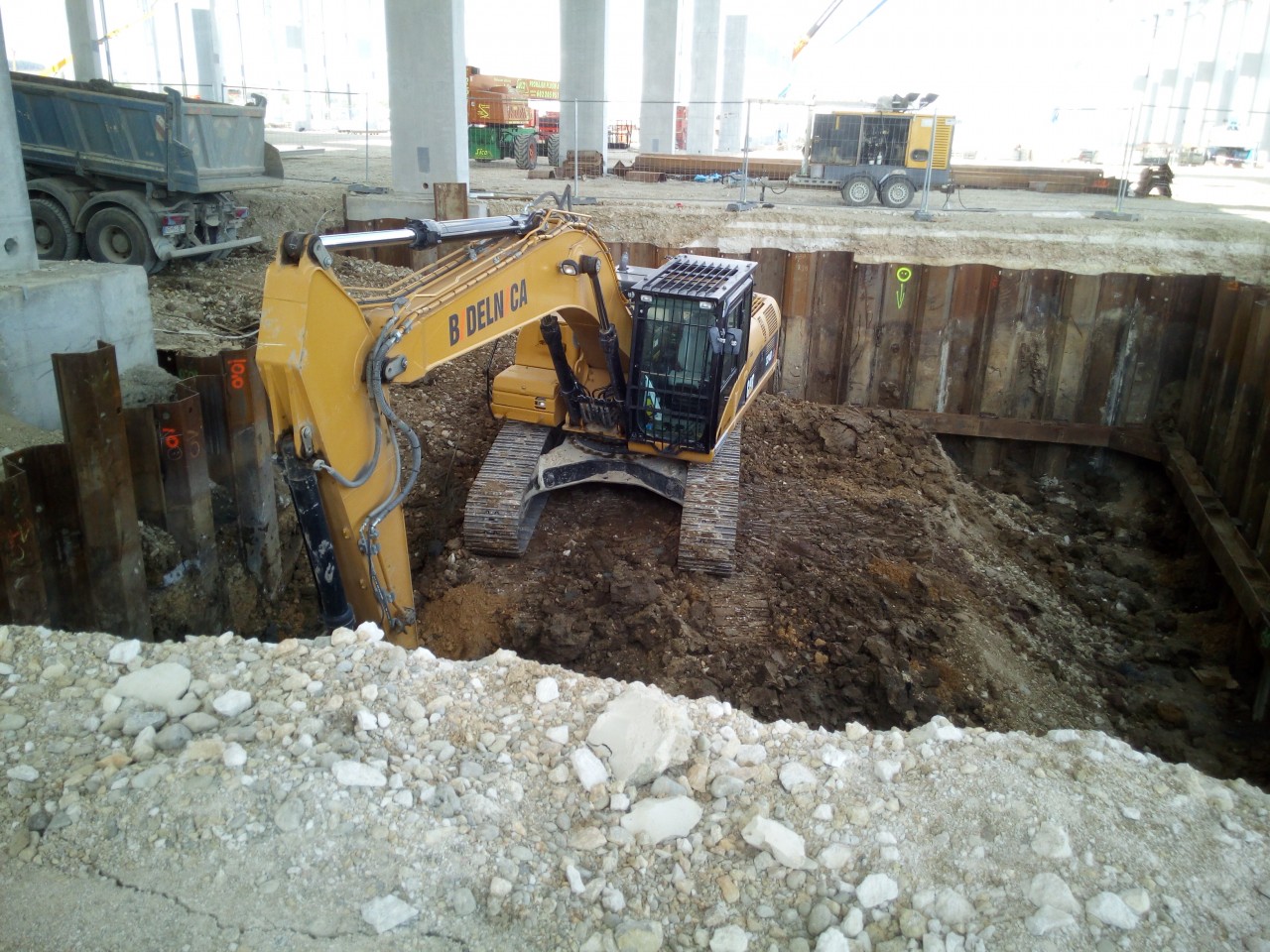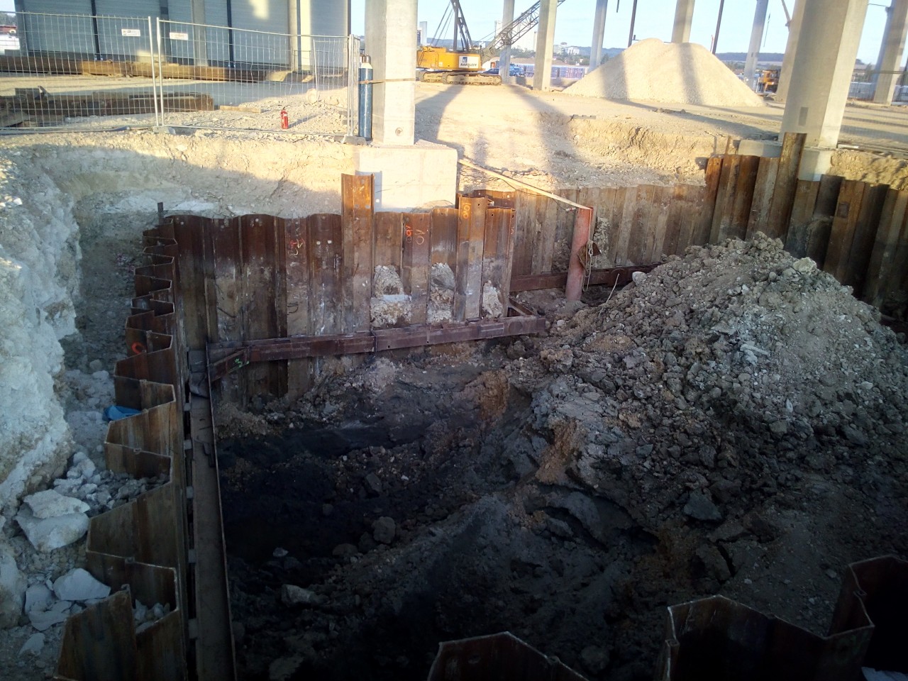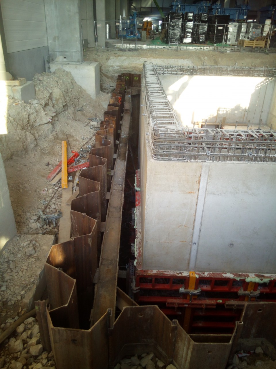 Průmyslový park u města Nitra se stále rozrůstá a místní geologické podmínky vyžadují často technologie speciálního zakládání. V tomto případě se na nás obrátil Investor s požadavkem na řešení pažení několika stavebních jam, které bude spolehlivě chránit před vyšší hladinou podzemní vody (na rozdíl od dříve provedených technických řešení konkurenčních firem) a nebude zasahovat do prostoru monolitické konstrukce. Montáž i demontáž uvnitř haly při omezené výšce.